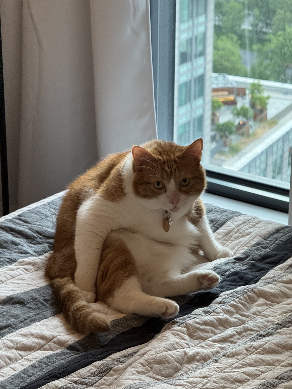 Named after a Ghibli cat (and is pretty much the exact same), lives like a middle-aged man, stares out windows like he’s lived 9 lives already. Muta is a chonky retired uncle in cat form, 6 years old with a vibe of 56 years old. He spends his days rotating between 4 nap stations, judging the neighbors from the window like a grumpy landlord, and sighing dramatically when you dare move him. His hobbies include loafing, yelling for snacks, and flopping in hallways for maximum inconvenience. He still hasn’t paid his rent yet, I think he secretly owns the place…?