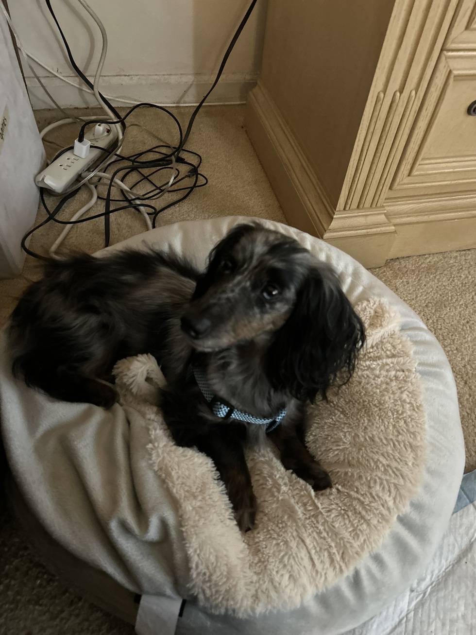 Wolfgang Amadeus G-Wagon Pilcher recently joined the family after being rescued. He is an incredibly sweet Blue Merle Longhair. He loves walks; peanut butter, toys, and chasing rabbits! He is such a loving; chill boy!