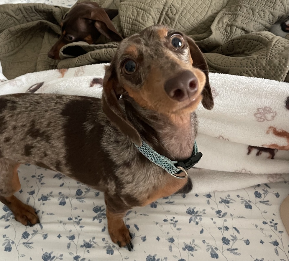 Padme is a 2 year old dapple mini Dachsund and she is the derpiest little moron. I love her with all my heart she is the most affectionate girl and she loves to play and disembowel stuffed toys. She is super tiny compared to her sister and we have no idea why she didn’t grow more but we love our little peanut.
