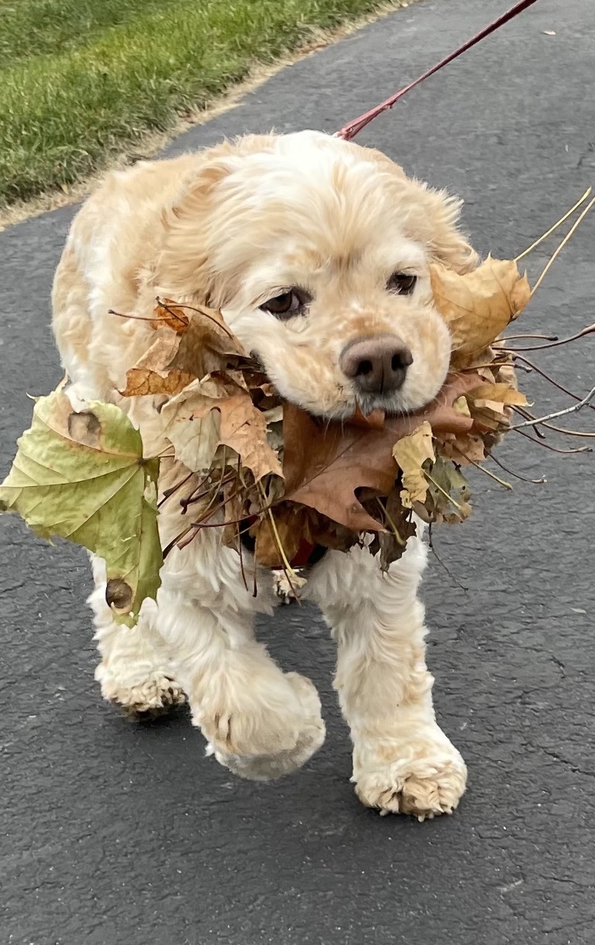 Bruces favorite time of the year is in the fall. He just loves bobbing for leaves. He fits as many as he can in his mouth.