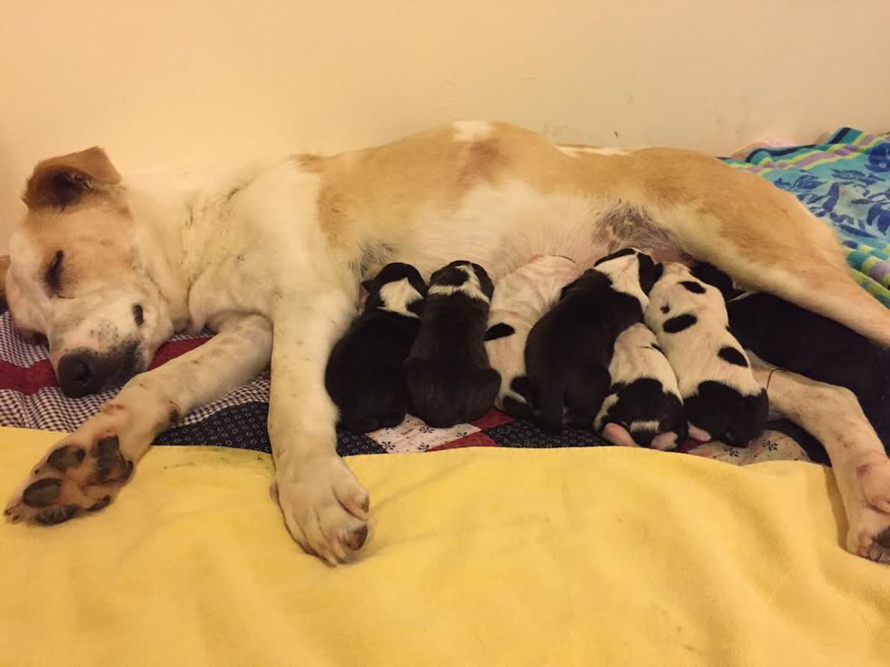 Your Pet's Story or BioThis is Kalliope. She had been hit by a car when she was very pregnant which injured her jaw and leg; however, she and her puppies survived. The Animal Welfare League of Alexandria took her in and she soon gave birth to 8 puppies in foster care. This photo is right after she gave birth.