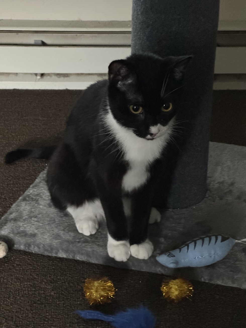 Batman is approximately two years old and was adopted from SNAP. He is one of the sweetest kitties you’ll ever meet. He is a handsome guy with a shiny coat that is as soft as bunny fur. He is very loving and cuddly. Batman is full of energy and loves to play. His favorite toys are his wand toy and his tunnel (with five arms for him to pop in and out of). He skidders and skids through it when his dad drops the end of the wand toy into the tunnel. He is so full of positive energy the entire day that’s it’s hard to ever have a bad day. He has become his dad’s rock. He even helps his dad win at video games by putting his paw on his dad’s hand! Batman LOVES Temptation’s Lickable Spoons and makes sure he cons his dad into several every day!