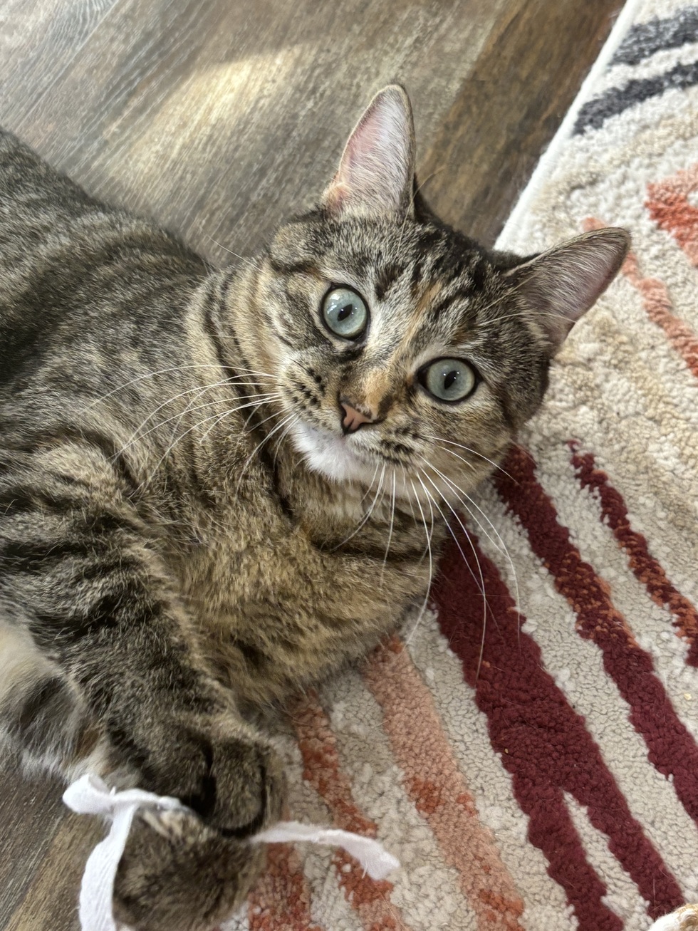 Wanda is just over a year old, she was adopted from CNY Snap a year ago. She was a tiny stray found in the city of Cortland. She loves to watch chipmunks from the window and loves to beg for English muffins from her human dad every morning, she loves butter and carbs, who can’t relate to that?
