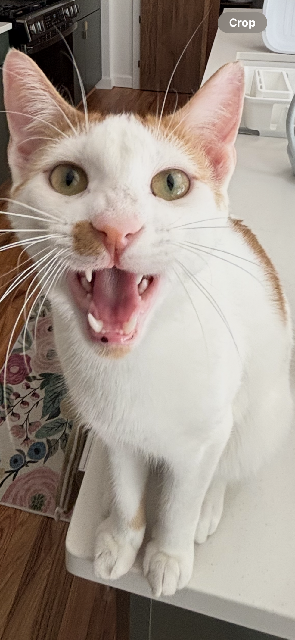Keebler sitting on the counter where she knows he shouldn’t be, Keebler doesn’t care, he does what he wants and will tell me so to my face, as he is doing here. He’s about a year old, started as a foster with his three brothers, he became very sick and during treatment we knew he wasn’t going anywhere! He’s a sassy boy who loves to snuggle, and sit on the counter.