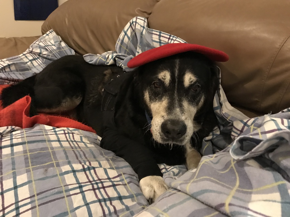 Atlas is the sweetest gentlest old soul who found his way to Our Companions Animal Sanctuary in Connecticut from Florida. He was my best walking and snuggling buddy at the Sanctuary for almost 2 years until he was adopted by his veterinarian and is now living his dream life! Atlas always has a smile on his face and loves to snack while taking walks. In this photo he is dressed up like a French artist to celebrate the painting he created for a charity auction. Smile on, my friend!