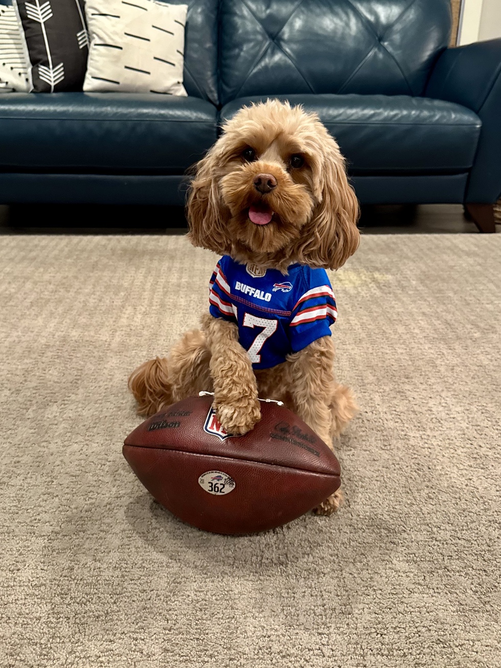 Winnie’s favorite part of the day is heading out for walks around the park, where she happily supervises the neighborhood and greets admirers along the way. When she’s not on duty, she enjoys showing off her sense of style—especially her beloved Josh Allen jersey, which she wears with undeniable pride. Most of all, Winnie loves her family fiercely and stays close to them whenever possible. She also has one very mischievous guilty pleasure: sneaking and eating dollar bills whenever the opportunity arises. Loyal, bold, and endlessly entertaining, Winnie proves that big personalities truly come in small packages.