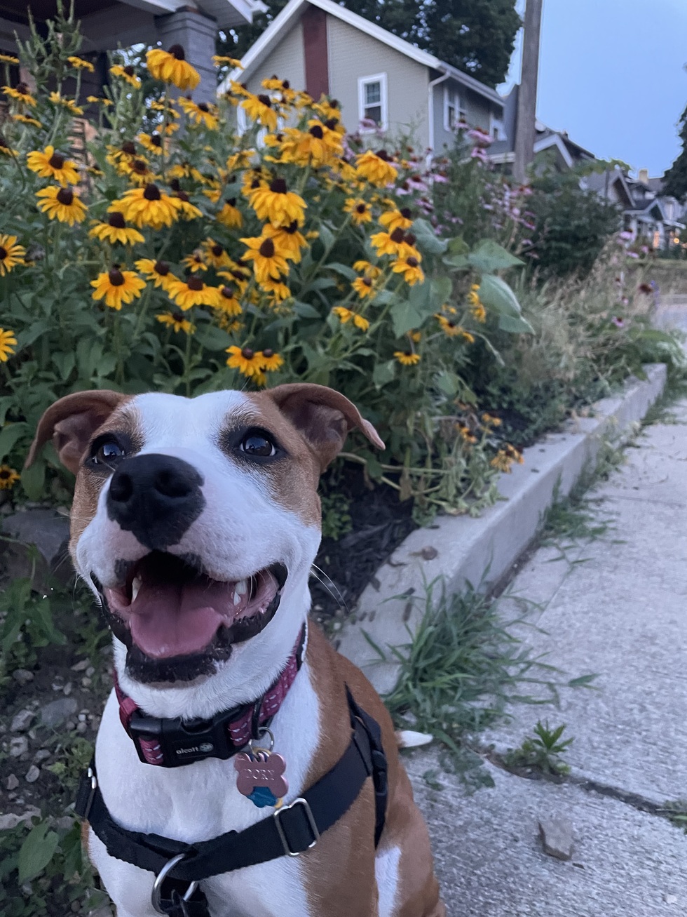 Dory and her puppies were found living in a shipping container yard in Kentucky but were thankfully brought to a rescue organization in a neighboring state for a chance at a better life. Dory now lives with her two humans and loves to snuggle, chase toys, play with friends at doggy daycare, watch neighborhood happenings out the window from her chair, and end the day wrapped in a blanket. Her heart-shaped nose is her external exclamation that she is the absolute happiest pup in the Midwest.