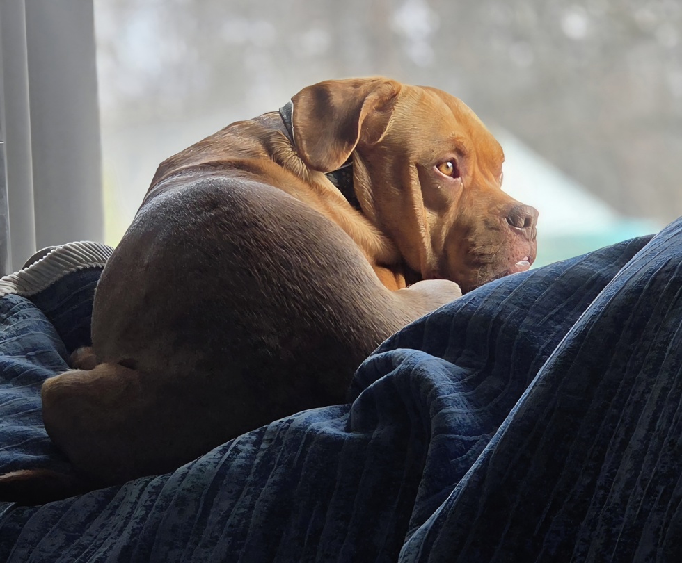 About a year after losing our first family dog, we were ready to open our hearts and home to another. When Scarlett O’Hara’s perma pout came across the screen, I knew we had to meet her. She came to Crops and Flops as a stray from Brockton with some major skin issues (and come to find out allergies to what seems like everything). Now Charlotte, or Charli, as she goes by, became part of the family immediately. Even our older dog Chance, who has very discerning tastes when making friends, couldn’t resist Charli’s charm. She is the playmate and cuddle buddy he’s been longing for. Whether it’s the constant flops for belly rubs anytime and anywhere (even if we just had them a minute ago), the many crazy sleeping positions (generally with her tongue out), or the need to invade your personal space for kisses and cuddles, she always brings us joy.
