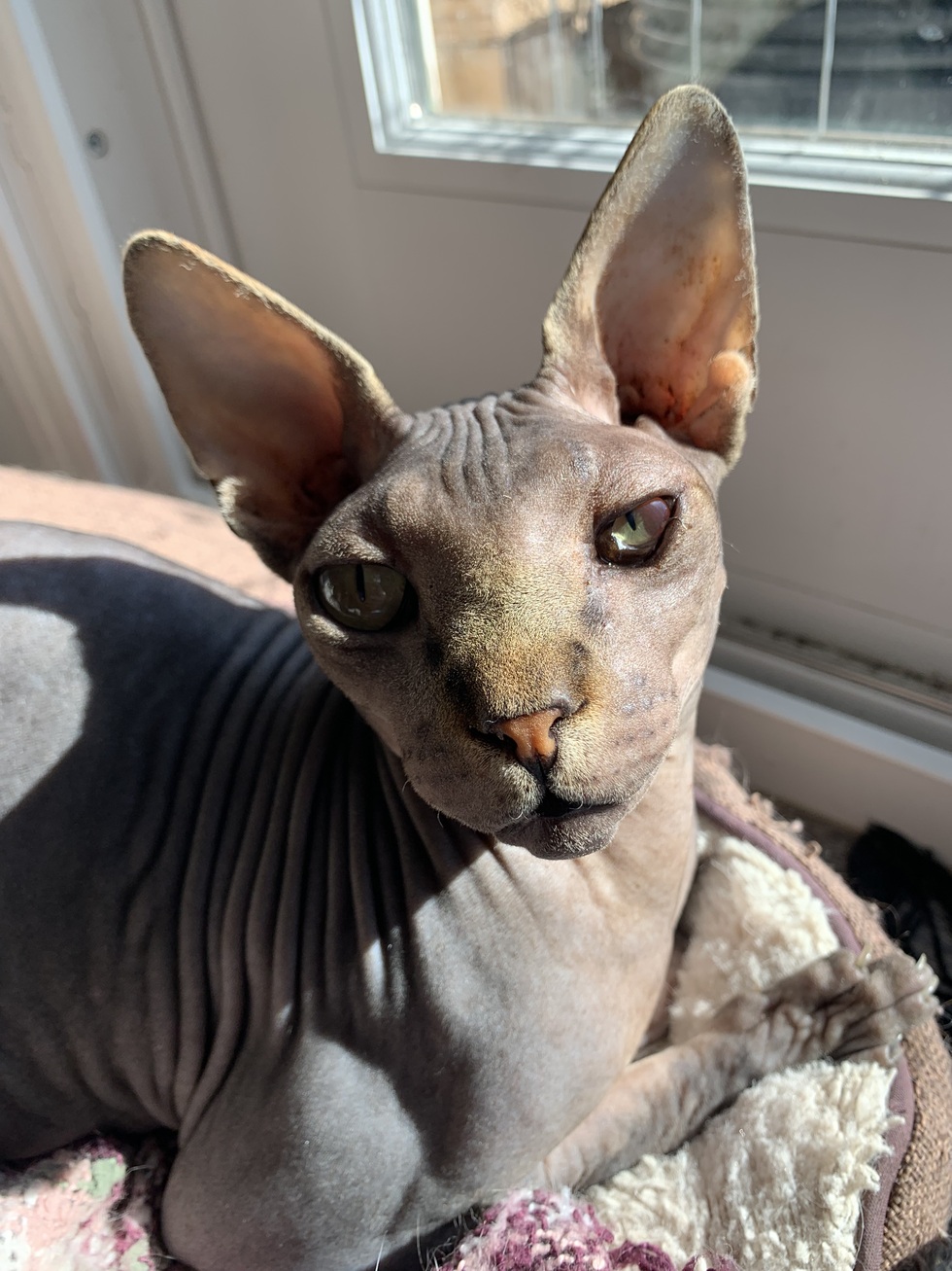 Cimmerian Jean was born September 1, 2019 and came into our family later that year. What he lacked in hair he made up for in personality. Cimmerian was a very vocal, warm and snuggly boy who loved Churu and his older furry siblings. He never met another cat or dog who wasn't immediately his best friend. A unique and beautiful boy, we lost Cimmerian in December of 2025. Though he is no longer with us, the impact he made on everyone he met is one that continues. We miss you, our little Goblin Boy 💛