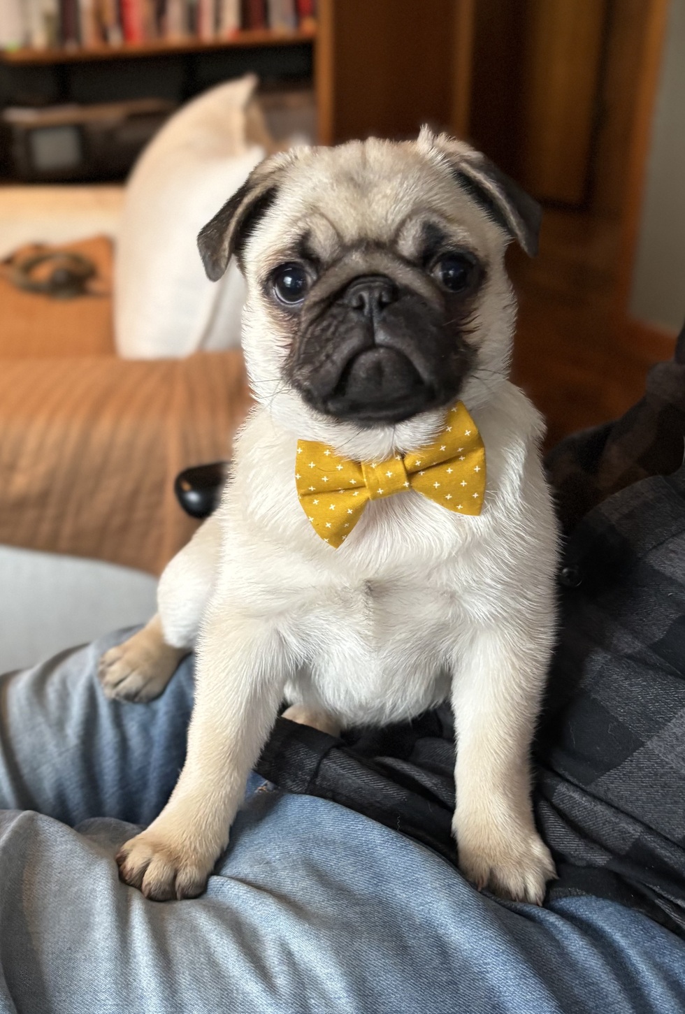 Monchi puts the "pug" in pugnacious. She is the youngest member of a multi-pet household. She spends 1/3 of her time sleeping, 1/3 of her time cuddling, and 1/3 of her time giving her big "sisters", Pepper and Raven, grief.