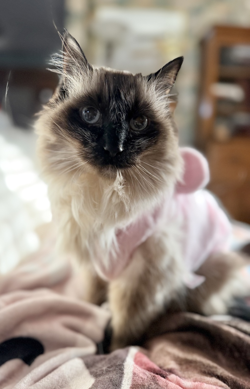 Estrella was found wandering the streets looking for help. She was chipped, but her original family declined to come get her. It appears her original owners were elderly, and either passed away or were otherwise unable to care for her any longer. Their family then rehomed Estrella, but the new owners sadly did not care for Estrella the way she deserved. Estrella was officially adopted from the Lawrence Humane Society by her forever family in April of 2025. She is around 16 years old, based on microchip data. After some much needed TLC, this gorgeous girl is thriving and enjoying life. She loves food, cuddling, playing with her toys (like Sir Oscar the Octopus) and playing chase/tag with her people! She was named Estrella, because her face looks like it was kissed with star dust when she was sent to Earth by her sister in Heaven.