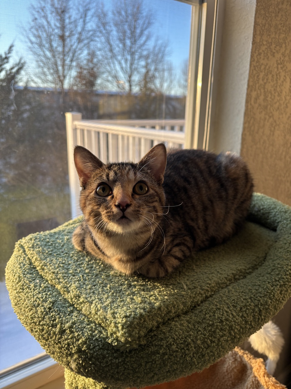 Meet the household’s most accomplished resident, a two year old cat with a list of talents. Adopted from the Lawrence Humane Society, she arrived wearing every color known to the feline fashion industry (a calico brown tabby of course).