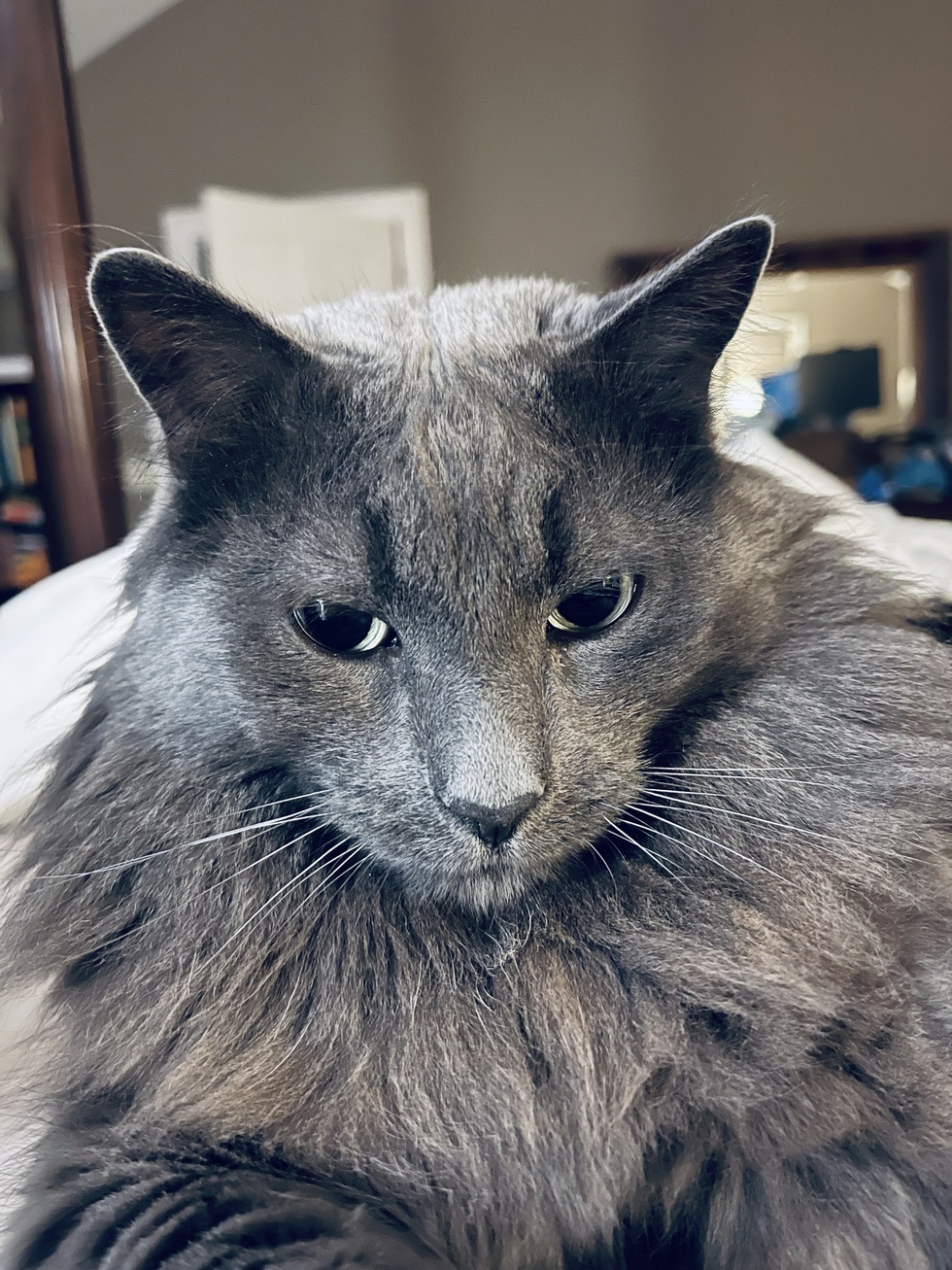 Sage is a rescue. He was living on the streets and had pneumonia and was covered in flees. He was only 4 lbs when I found him. He now weighs 18lbs and has been with me for 7 years. He’s my best friend and sleeps at the crook of my arm. He loves to snuggle and make new friends. I believe he’s a mix but closely resembles a Russian Grey.