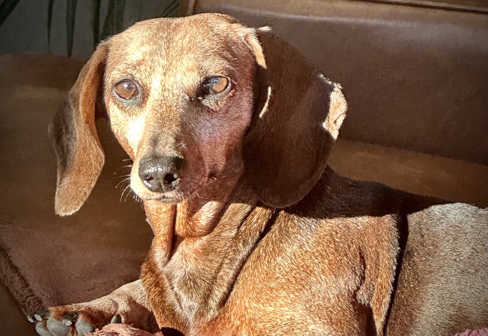 London came to us as a rescue from the China meat markets through DSFR four years ago. She came to us with lingering sores and very minimal social skills as she had been caged her whole five years in China. Not only has she adapted to the US, she is living her best life with us now. Her ears that once were droopy not stand tall as she eats her way through everything. She must be cuddled beside mom or dad and as a typical dachshund she takes three quarters of the bed at night. We like to say, we did not rescue her, she rescued us thanks to Dachshund South Florida Rescue
