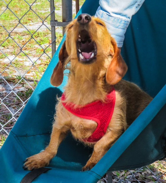 I adopted Schatzi at 6 months. He expects all humans to want to pet him and give him treats. Schatzi goes shopping with mom everywhere. In this photo, Schatzi is singing the song of his people.