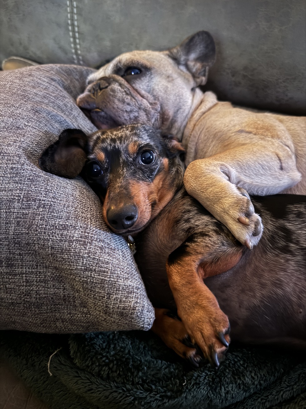Mochi is a dapple we found in Sebring, FL! She has one blue and one brown eye. Her favorite thing to do is steal toys from her big brother Odi (French bulldog from Ukraine!). Mochi loves her belly kisses from mom & dad 💕.