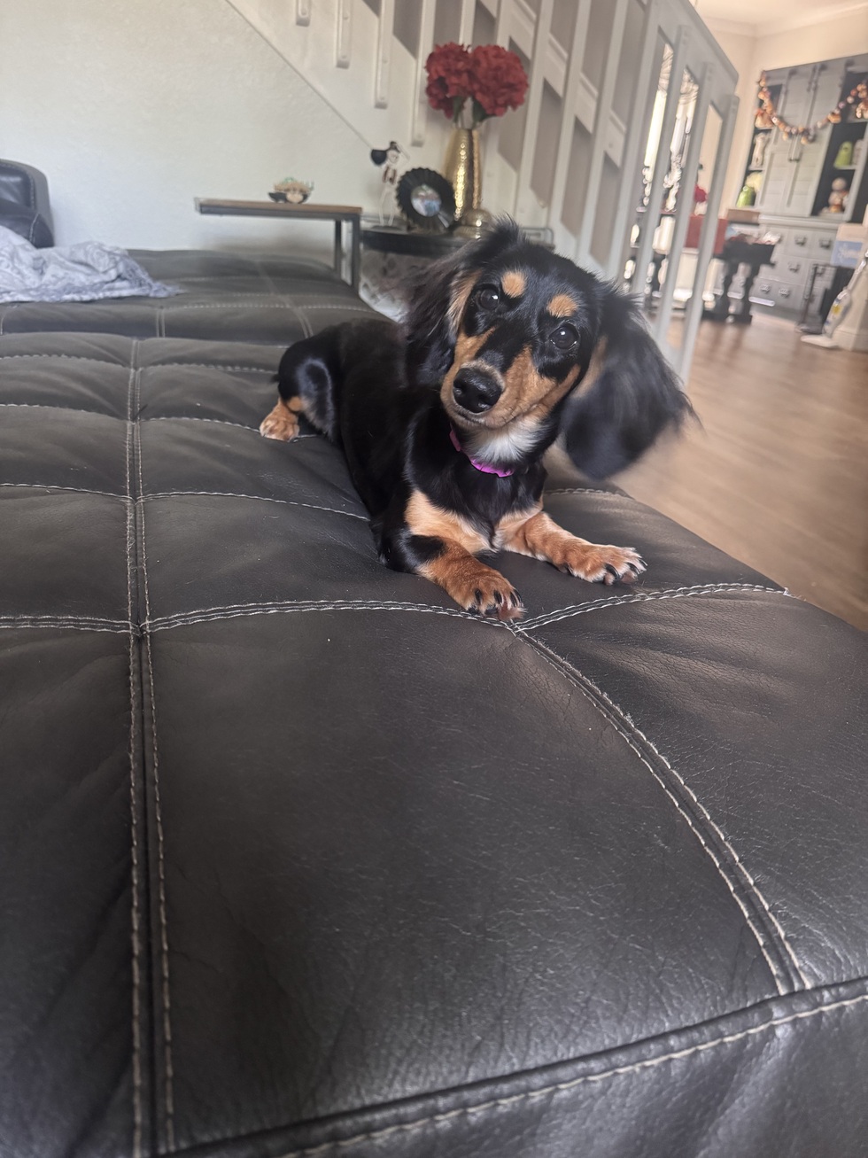 Molly is a 1 year old bundle of energy and tornado. She is the youngest out of 4 dachshunds. She loves to chase lizards and dragonflies, and enjoys cuddling with her siblings in the sun.