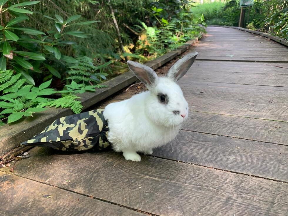 Pet's Story or BioJack is a special needs bunny who is paralyzed. The bag protects his legs from friction burns. He does not let his disability stop him and lives his life to the fullest! Due to needing his bladder expressed regularly, he gets to travel often going where no domestic bunny has probably gone before. He’s a very plucky and bold bunny who enjoys these adventures. Pictured is on the boardwalk at Cranberry Glades in West Virginia. He has his own Facebook and Instagram page of his adventures and to show a special needs bunny or any animal for that matter can have a happy life. (Facebook: JackInTheBagWV and Instagram: Jack_InTheBag)