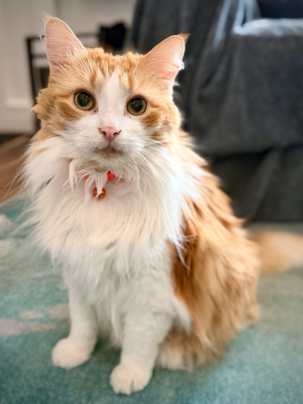 Unlike his Shakespearean namesake, Tybalt is a sweet and patient cat who loves cuddling up on his favorite pillow or human's lap. Since he was adopted in early 2015, this prince has reigned over apartments and homesteads alike with his kinsmen, Nimbus and Griffith. Receiving two square meals a day, both breakfast and dinner are tied for his favorite. He was diagnosed with diabetes in 2021 and never minds taking time out of his busy schedule to let the commoners give him insulin. Aside from the finest warm laps and food, he enjoys appraising all of the cardboard boxes in the commonwealth, mucking about in the sink, and moving his favorite toys from one room to another with plenty of fanfare.