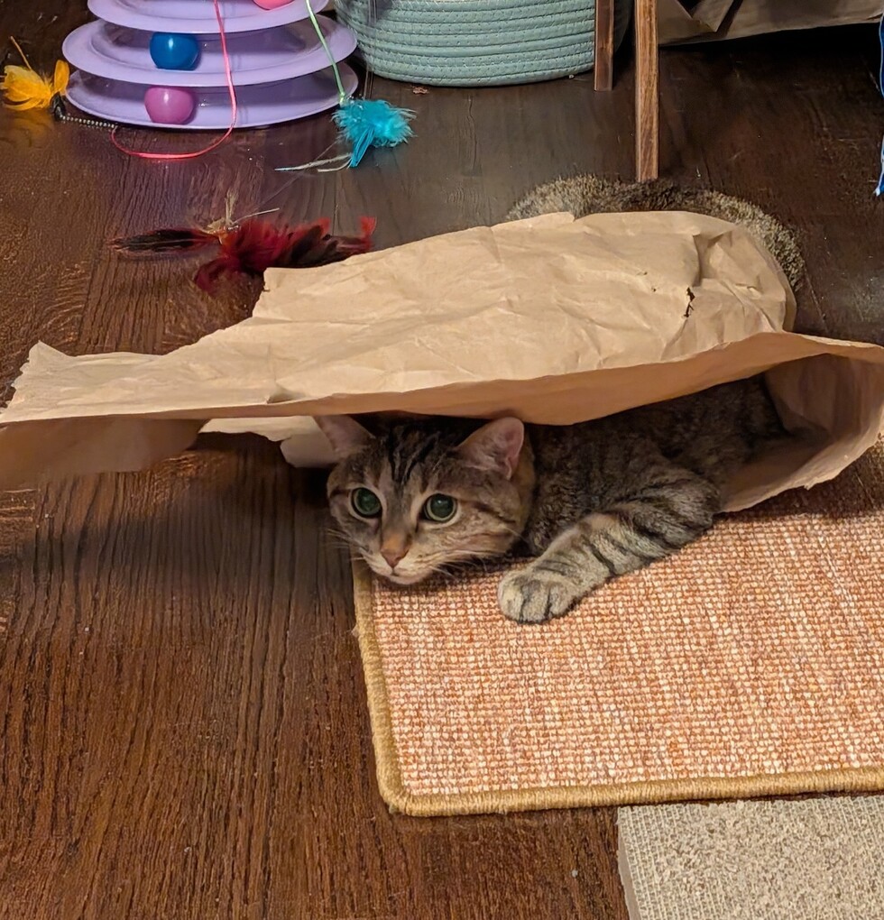 I adopted Baby at five years old and she was never very interested in toys. She was diagnosed with diabetes earlier this year and ever since getting treatment, she loves to play! Crinkly paper and strings make her go crazy. I'm so grateful that she's happy and healthy.