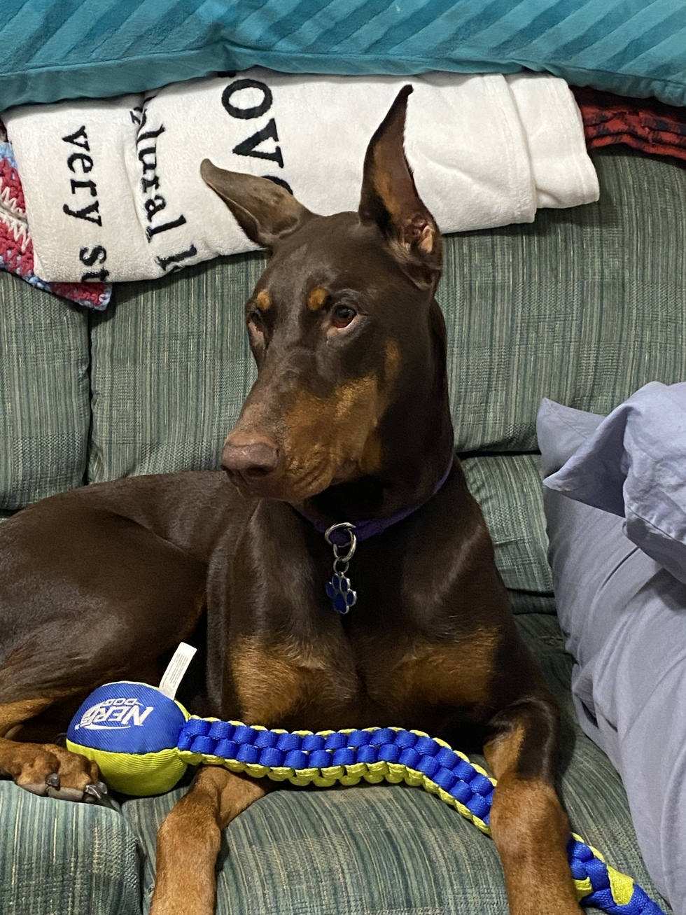 Ruby is 16 months we are her 3rd and final home. She loves tennis balls and bully sticks. She is a mama's girl but has learned to love her dad very much.