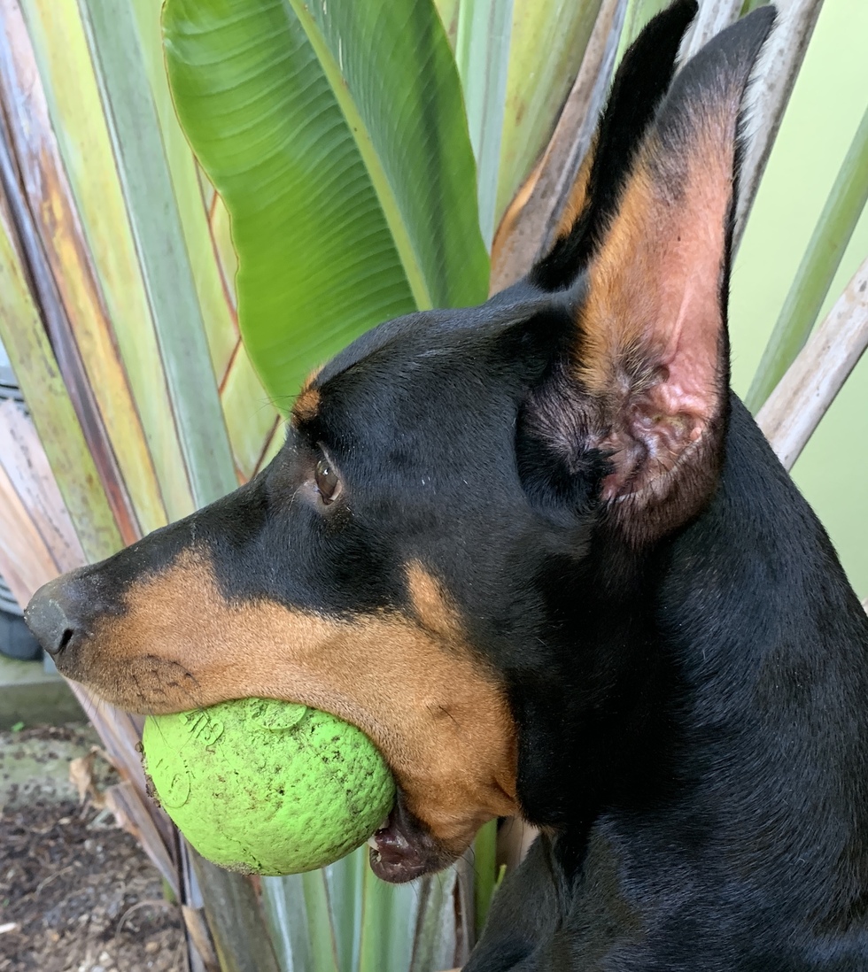 Estee was with breeders until I adopted her 2 years ago. She was in a crate or outside in a small pen for 4 years. She was very fearful and not socialized. She has really blossomed and loves visitors. Her ball is her security. She goes no where without it!