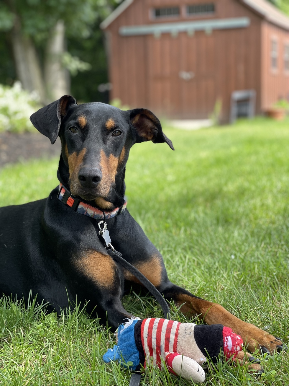 Twizzler, affectionately known as Twiz, is a very handsome 9- years-young senior male who is looking for his forever home. Like so many of our Dober-boys, Twiz requires a person who can provide consistent boundaries and clear rules along with the affection this guy naturally inspires. There’s so much to love about Twiz: he’s a great walking partner and he loves to show off his obedience skills. If splashing in the kiddie pool was a sport, Twizzler would represent DRU in the Olympics! If that’s not available, he will joyfully play ball with a human friend. The staff, volunteers, and our trainer have spent a lot of time with Twiz and he’s come a long way. Now it’s time for him to find a person of his very own to keep on this positive path forward. Twiz has had a few health challenges in his life and has been treated for pancreatitis as well as an obstruction and has had his stomach tacked to prevent bloat. He is also Lyme positive. None of these issues will prevent Twizzler from leading a fulfilling life with Dobe-savvy adopters
