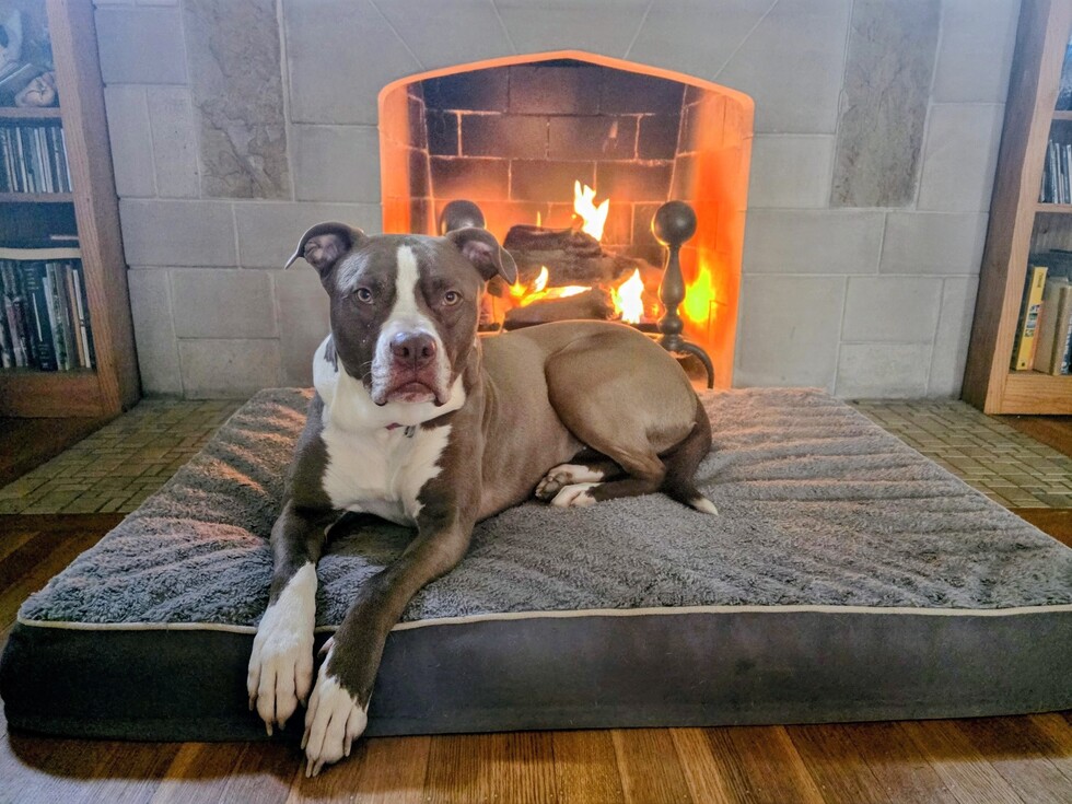 Since the summer of 2022, Dahlia has filled our days with smiles, love, and fun. She’s my loyal sidekick, my attentive listener (mostly!), and the best cuddle buddy. She and my tabby cat, Rocky, were friends from the start and play very nicely. Every night we all curl up together to sleep and keep each other warm. Dahlia loves dressing up in cute clothes and has a beautiful, colorful, glowing necklace she loves wearing. She’s equal parts couch lounger and adventure buddy—always ready for hikes, camping, kayaking, and even music festivals. She takes her role of being cute, greeting guests, and announcing deliveries very seriously!