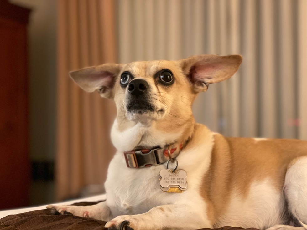 Dugan joined us from Fresno, CA, and spends as much time as possible in the sun (some compare him to a cat or a lizard). When he's not catching rays, he's scrounging for scraps, barking at the mail carrier, or just being adorable.