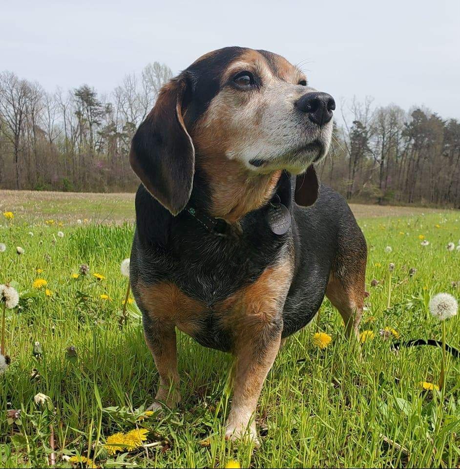 He was found under a corn crib in the Glendale area about 7 years ago. We took him to the vet and he was heartworm positive and had internal bleeding.  We got his treatments and got him all fixed up. He was a hunting dog at one time because he will track a rabbit if he gets the scent.  He loves too cuddle and sleep in bed now.