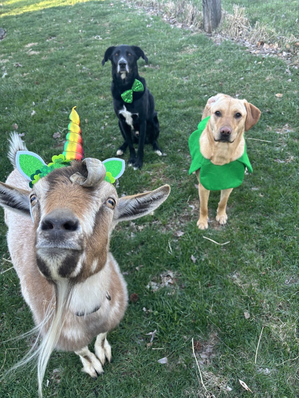 Syd the goat is the main entry. Pictured with dogs because he thinks he is one.  I got him when he was less than 24 hours old from a young gal that “rescued” him from a sale barn and then bottle raised him.  He is now 11 years old and acts like a toddler. Constantly putting things in his mouth that he shouldn’t and constantly raising havoc.