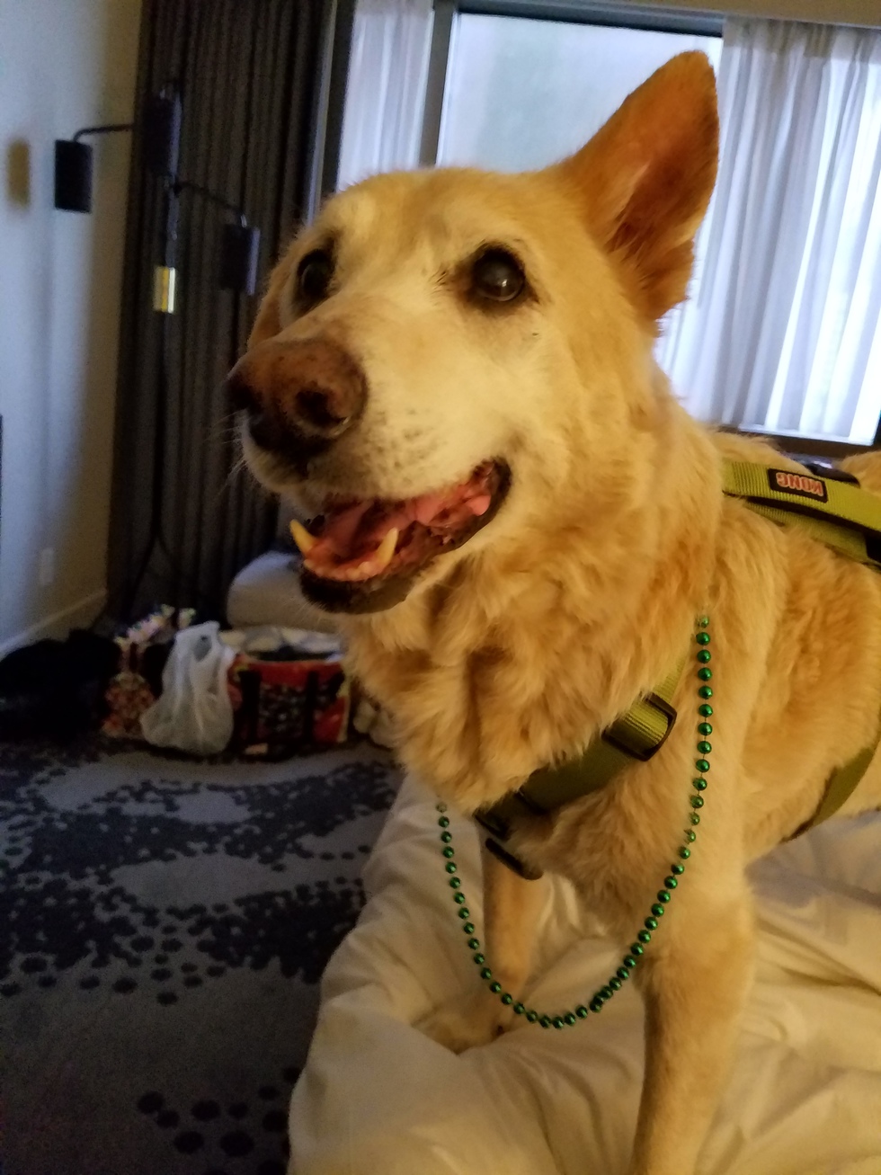 Padrigh loves to travel, the picture submitted, was of him down in NOLA during Mardi Gras, those are his beads around his neck. He loves MOST PEOPLE, but is a great judge of character. Right now, Padrigh is helping two senior citizens with walks for physical therapy. Padrigh LOVES going to Petsmart and visiting with his favorite employee Lois, who has known him for almost his whole time with us. Padrigh was the "Pet of the day" on the everyday show 10 years ago. Padrigh LOVES his family, and friends. He is the very best part of our lives, no other would do!!