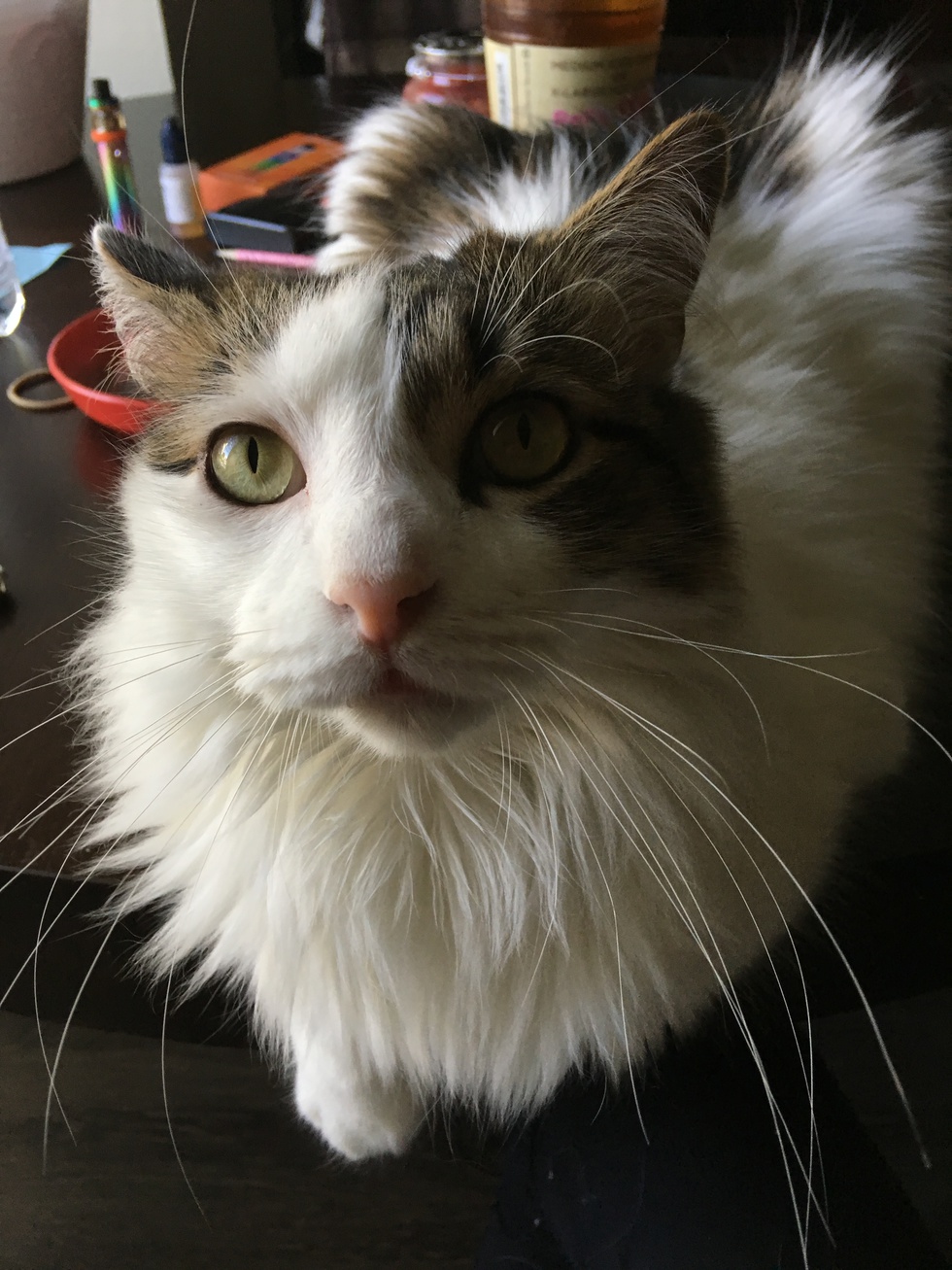 He was born with a bum leg and bottle fed cause abandoned the litter. He is a traveling kitty came from Texas. He is just a big cuddle bug!