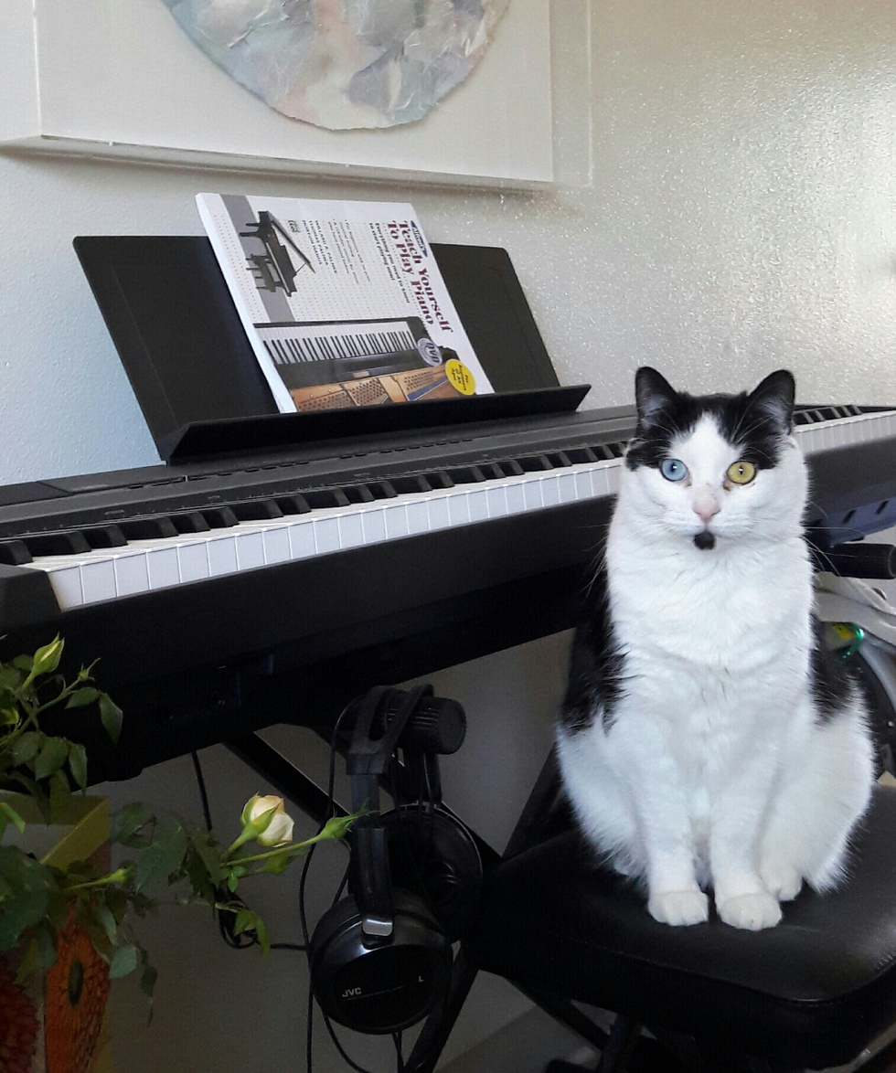 Your Pet's Bio/StoryWas ret'd to BC because too "lively" (3 mos old, duh) for little kids who still managed to decorate her with orange marker. Was asleep when I walked by but when I saw the two different colored eyes in the pic on the window, within an hour she was awake & on her way to a new home. She is the most laid-back cat I have ever been around & when a new, small dog from BC was brought home 3yrs later, took awhile to learn to share space but now, together, provide free entertainment 24/7. I laugh out loud watching them race each other downstairs for b'fast. Can't think of a better way to start the morning! (Pic is spur-of-the-moment. Doubt I could plan a pose like that with proper camera & tags.)