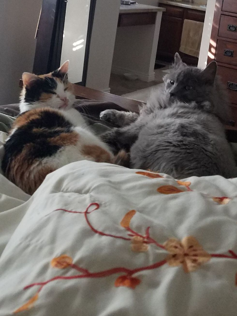 Your Pet's Bio/StorySilverado is a codgery 16 yr old male Main Coone and Kalie is a bouncy 3 yr old female Calico, both adopted from the DFL. Kalie's energy has revatalized Silverado and made him act young again. The two of them became fast friends and are peas in a pod like big brother and little sister. Their personalities are wonderful to have around the house and we love our fuzzy 4-legged children very much. :-)