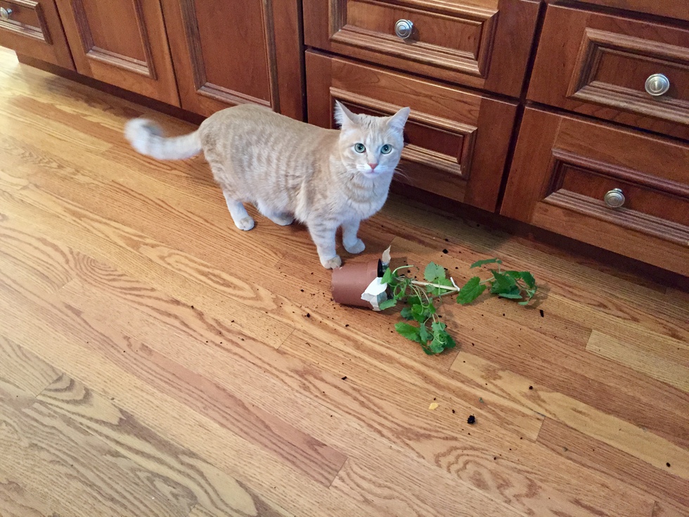 Your Pet's Bio/StoryWe adopted Ziv from DDFL in Aug 2014. He was a tiny, sick, and terrified kitten. He's grown into a sweet (but still a little on the scared side) and loving cat. In the picture, in his excitement Ziv had just knocked the catnip plant off the counter. I could see he was surprised and sorry, but was it because he made a mess or was it because he was afraid he'd lose his catnip plant? or neither? or both?