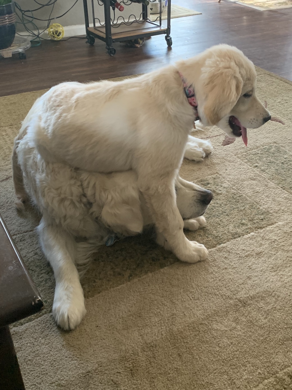 Clovers favorite pastime is to sit on her brother, Ollie’s head !!!