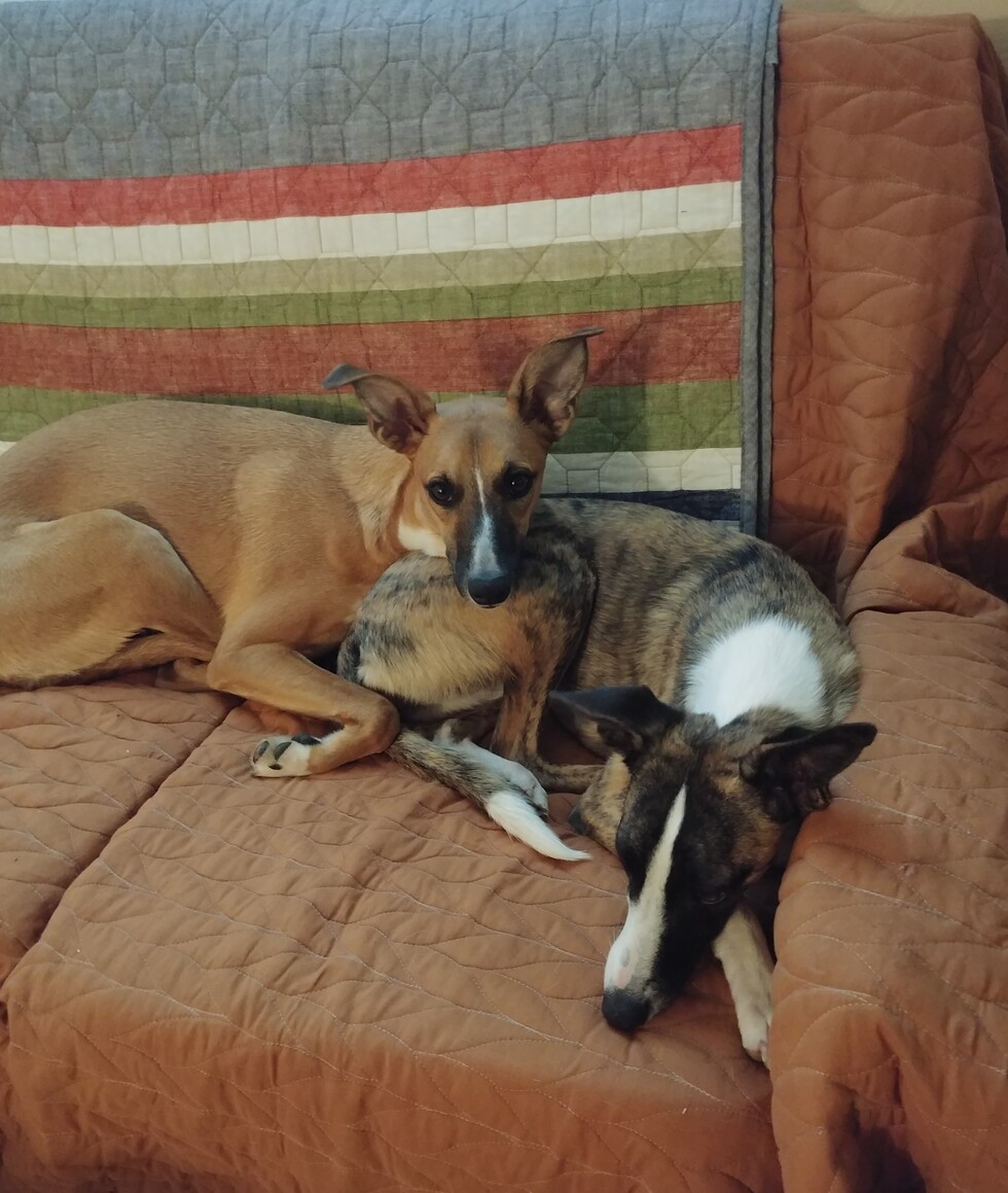 Your Pet's Bio/StoryDDFL had a litter of 9 whippet mix puppies. Saffron and Ambrosia were the last two of the adoptable puppies at an adoption event. Saffron climbed in my lap and Ambrosia hid, she was so shy. We felt the sisters needed to stay together so we adopted them both. Ambrosia fits the definition of Whippet, dainty and sweet and a great snuggler. Saffron is 10 lbs bigger, goofy and loving, definitely mixed with some other breed. These sisters have been a joy to our family, we are so blessed to have them in our lives.