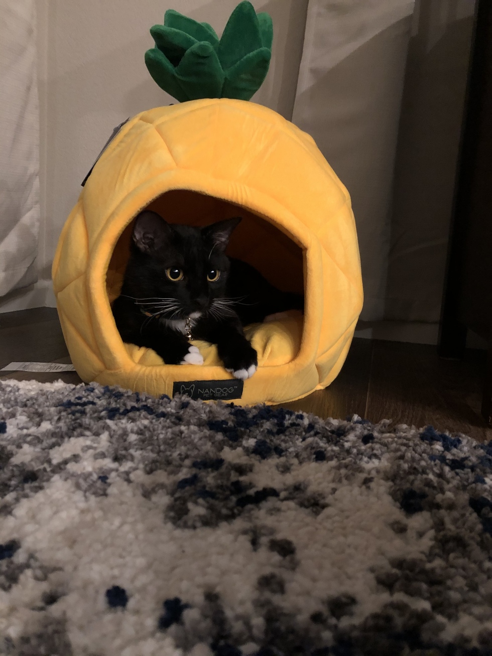 Your Pet's Bio/StoryJack was adopted from dumb friends league in February. He loves playing with string toys and sleeping in his pineapple. He loves cuddles and meeting new people. He is very adventurous and we started going on walks together. This picture was taken the first day he got his pineapple bed. It was the fifth day He was home and the pineapple is still his favorite napping place.