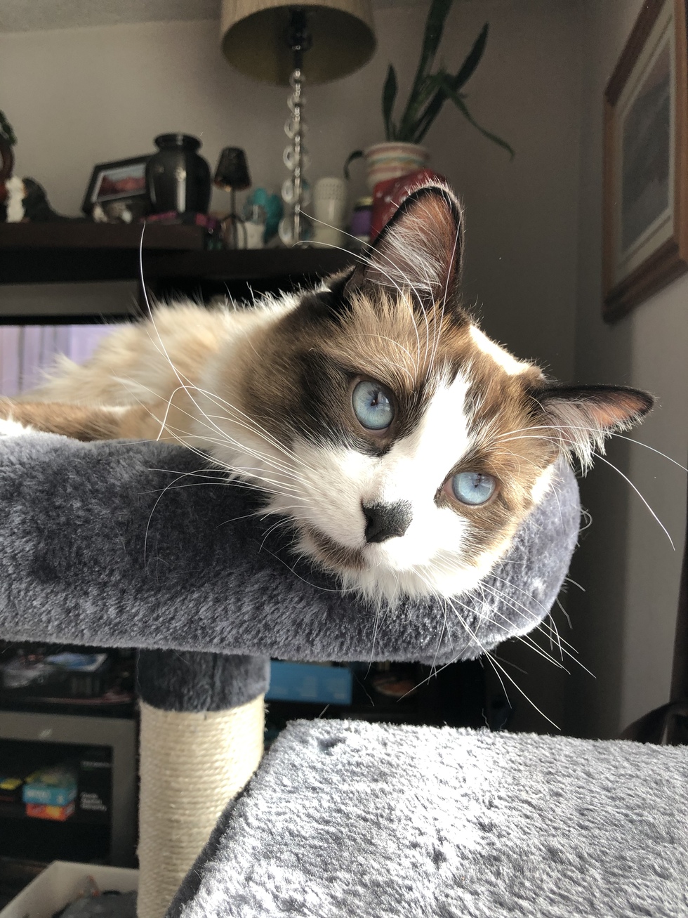 He was a shelter cat that was caught in a trap. We went looking for a dog and came home with a cat. We love him