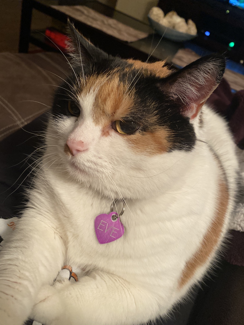 Your Pet's Bio/StoryWe adopted Eve from DDFL in April 2011. We actually went there to see a different cat but that one didn’t take to us. They brought Eve to us and she jumped right up on my husband’s lap, my son’s lap and mine! So easy going and sweet. She loves her humans and to bask in the warm sunshine.