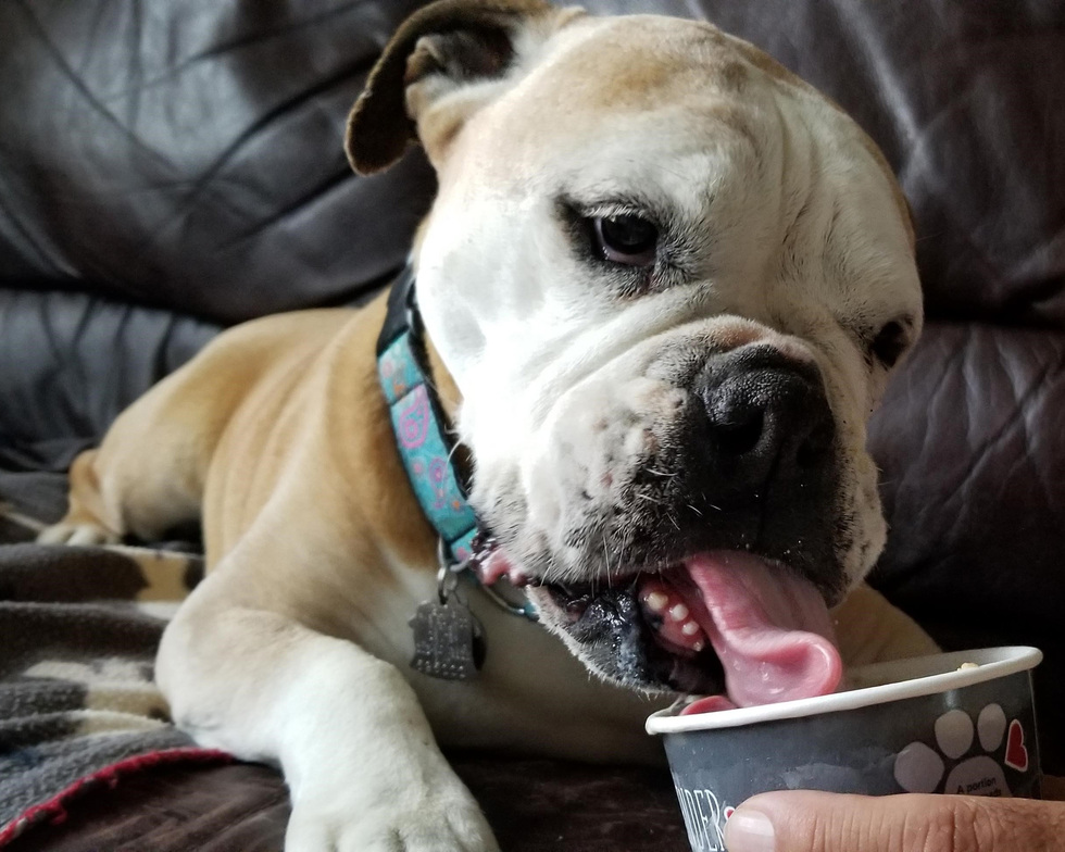 Your Pet's Bio/StoryMugi was adopted on July 3, 2014, shortly after our beloved DDFL Mesa (boxer/bulldog) passed on. After early challenges, Mugi quickly settled in and has been a blessing to us. She became my husband's service dog and helps him manage PTSD and depression. She also enjoys supporting other animals and in this photo, she's enjoying a PawBender. Since the Wag'N Trail event was cancelled, we participated in the DDFL's replacement fund raiser with Mugi buying 12 PawBender's that she loved every last lick of over time!