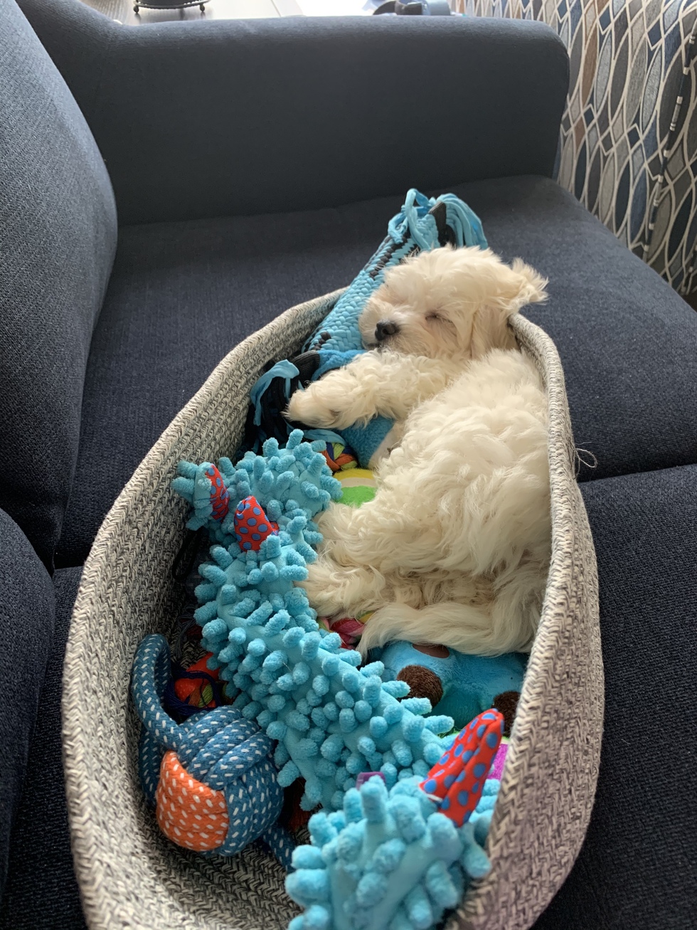 Your Pet's Bio/StoryBruce is a 3 month old havanese/bichon mix. He enjoys spending his day napping in his toy basket. When he needs to do some indoor running he loves playing chase that ice.