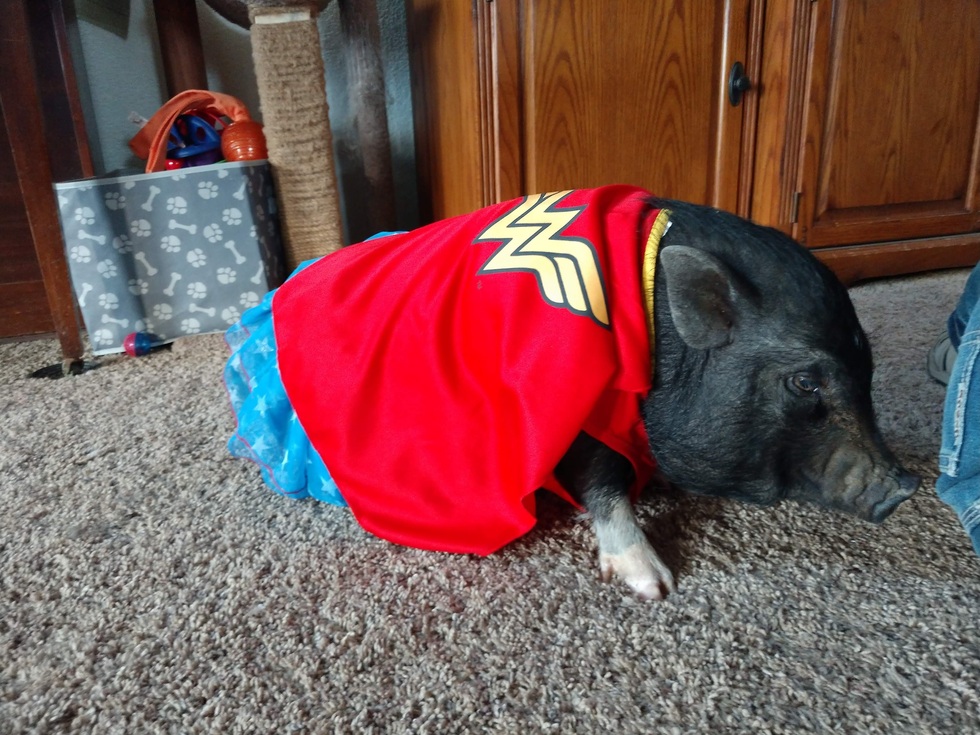 Your Pet's Bio/StoryChrissy is a mini-micro pig. Although she enjoys the outdoor open play area with the other farm animals, when it is cold, hot, raining, or dark she prefers her indoor comfy bed. She enjoys entertaining the neighborhood kids with her Halloween costumes and her tricks for treats.