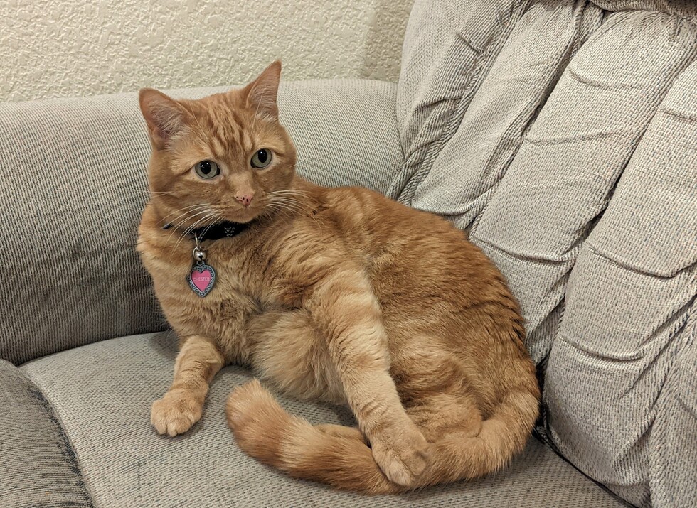 Chester is a scaredy cat, running from the doorbell. He likes variety in his food, and will drink out of glasses when left out.