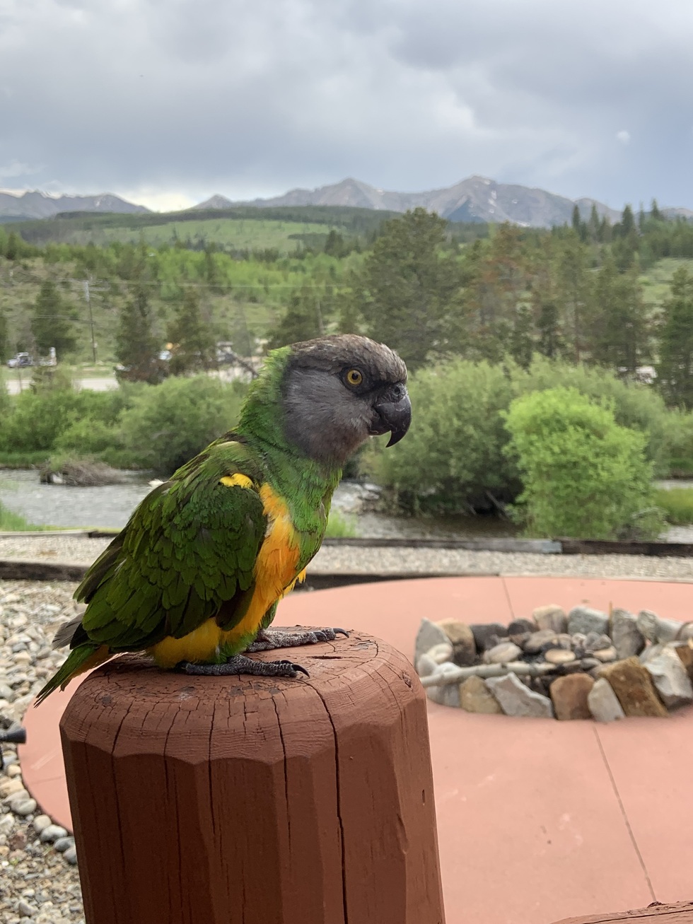 Your Pet's Bio/StoryBig-Daddy was born in 1996 and he is a Senegal Parrot. He lives in Breckenridge Colorado (where picture was taken) in the summer and fall, and in central Florida in the winter and spring. He is very friendly and loving, bowing his head to enjoying a scratch and rub of his neck feathers; Big-Daddy loves to be outside, and if given a cardboard box - will chew it up all day; He also enjoys chewing on pieces of wood; For snacks, Big-Daddy's favorites are caramel popcorn, corn, & peanut-butter. His claw nails get sharp - so we trim them about every 2-weeks, along w/ clipping his flying wings - to keep him home and safe.