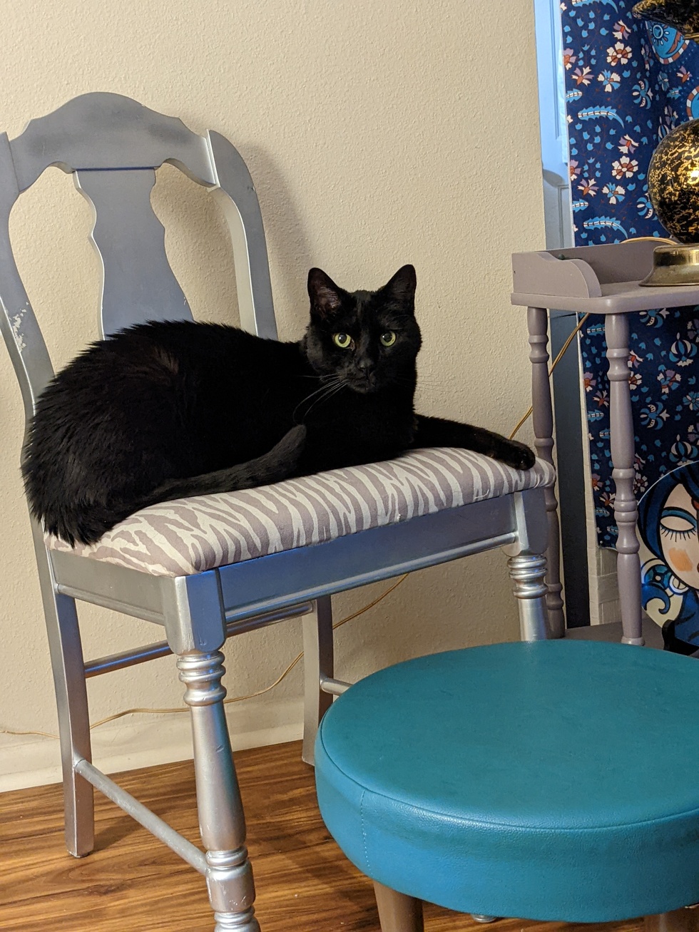 Your Pet's Bio/StoryI chose Tofu from the Dumb Friends League in 2015. I am a disabled veteran, so I got papers to make Tofu my official emotional support cat. Black cats are the most euthanized, so I walked in, met him on a Veteran's Day, and made that his birthday. He came home with me, hid for three days, so I thought he was a magic cat. He came out, we played and bonded. Anyway, he will be 12 this vets day. He is a fur ball of sweetness and love, and he gets special attention daily.