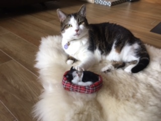 Your Pet's Bio/StoryWe got Layla from Foster Paws in Greenville , South Carolina - when she was 2yrs 2months old. Layla has been part of our family for 8 years now, and she lives half the year in Colorado & the other half in Florida. She loves to travel, both by car & air. She loves her catnip stuffed mouse and rabbit - and sitting and looking outside our windows. She sits on her food timer bowl, awaiting it to open so she can eat. She enjoys crawling under our bed covers at night - to sleep and purr loudly. She loves to lay and protect her mini stuffed kitty cat, as seen in the picture.