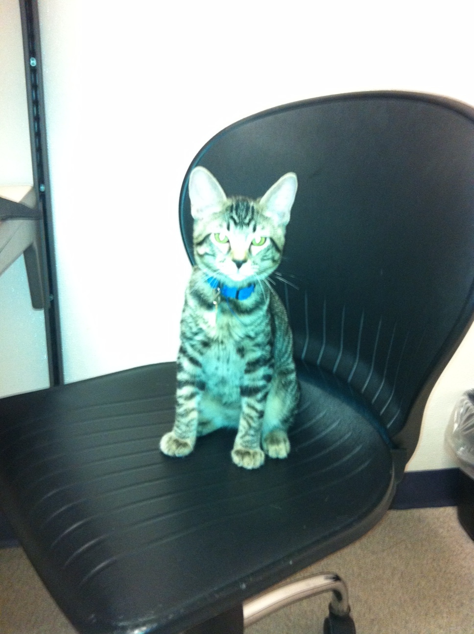 This is when he interviewed us at Dumb Friends. He came in and took a seat at the desk. We knew right away he was the “one”!