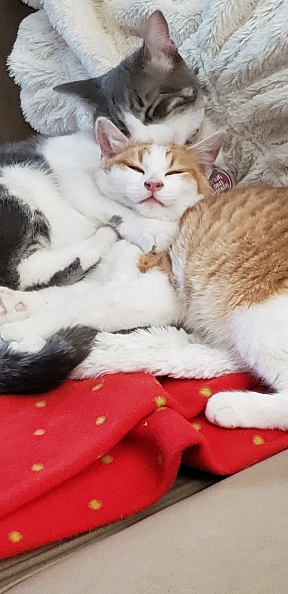 Your Pet's Bio/StoryNick (gold) came from Dumb Friend's in December, and Kris (silver) from a friend via Mexico the prior December..hence holiday names. Kris needed a buddy and they were best friends immediately and snuggle, play and sleep together.